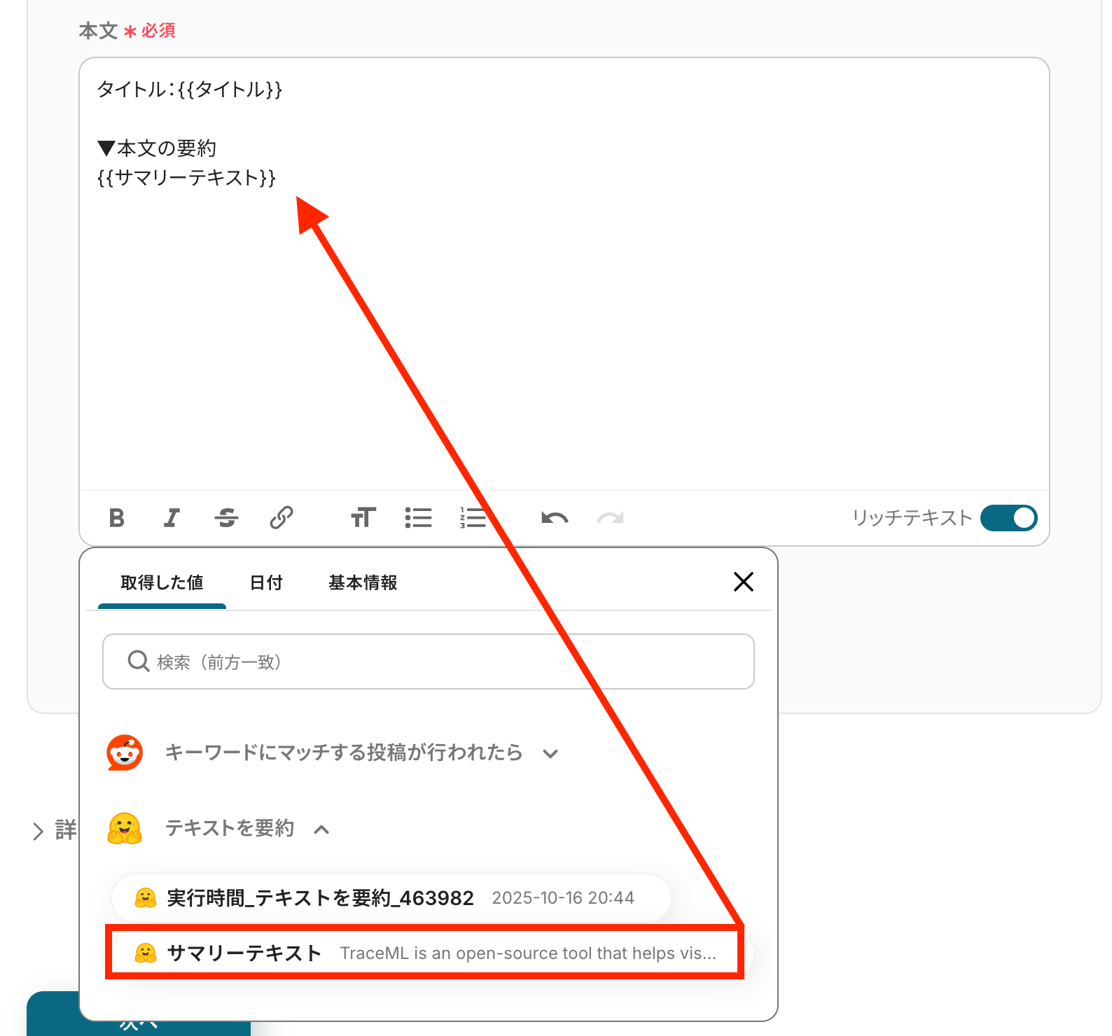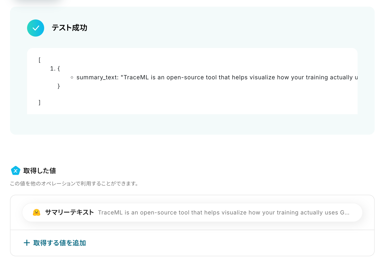 「テキスト」には、Hugging Faceで要約したい内容のテキストを設定しましょう。