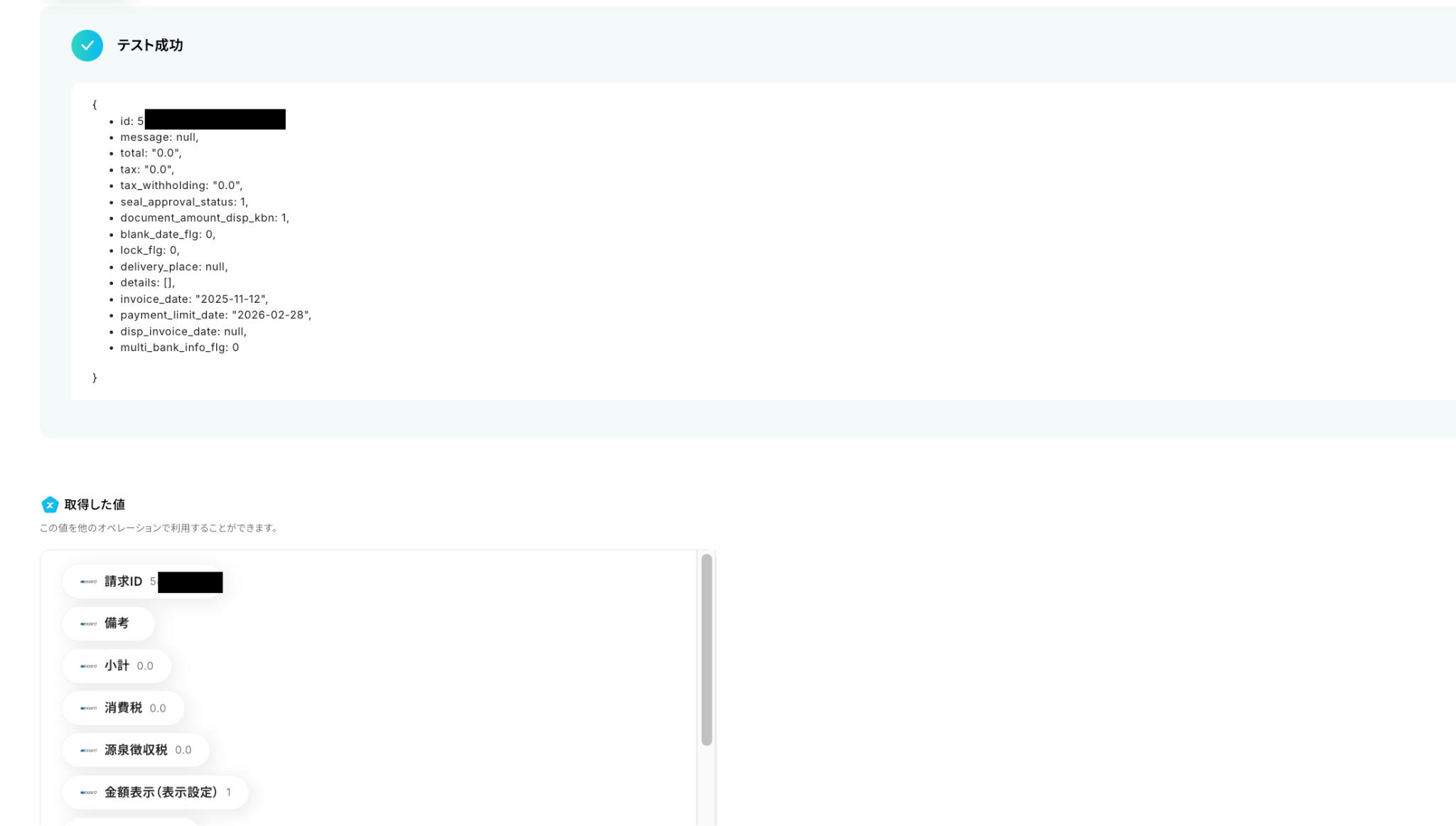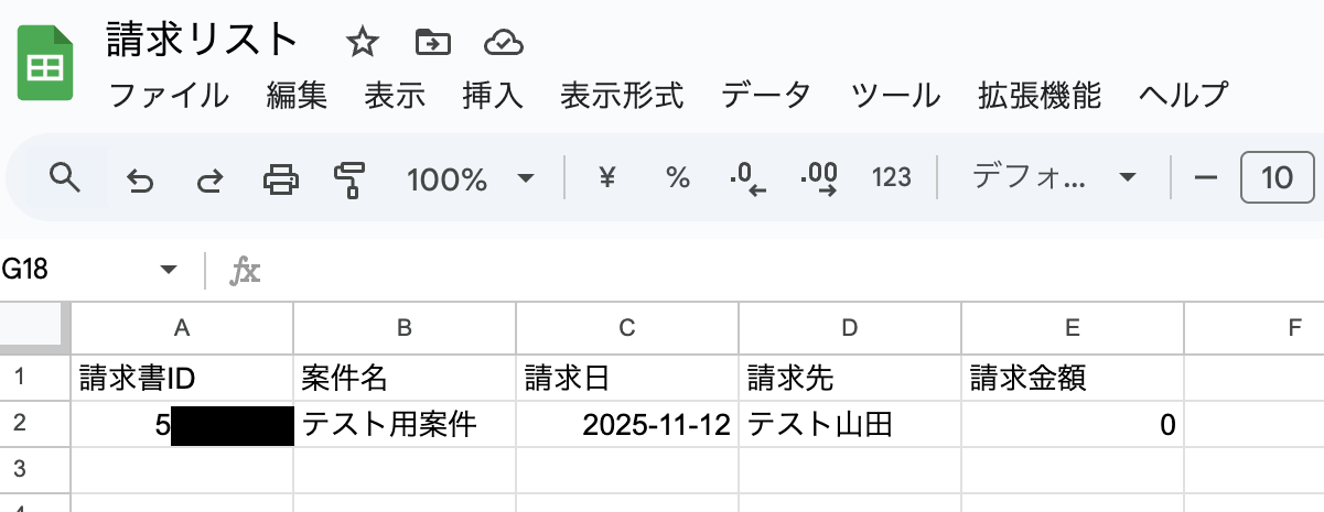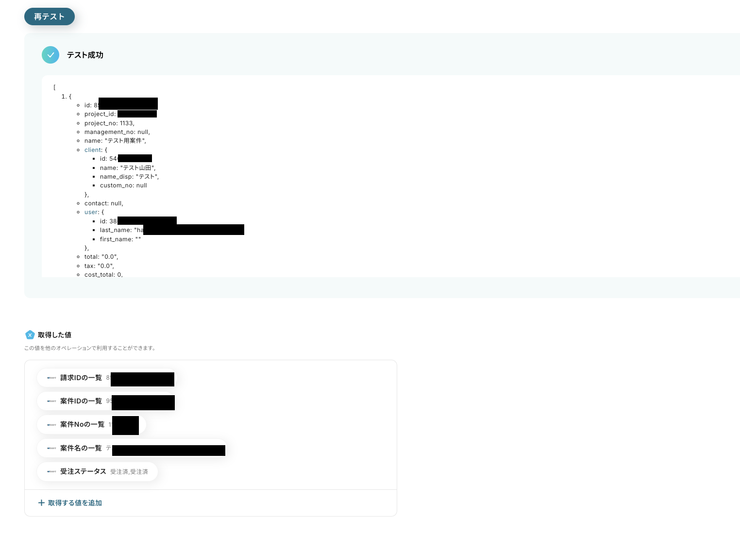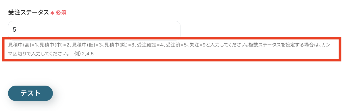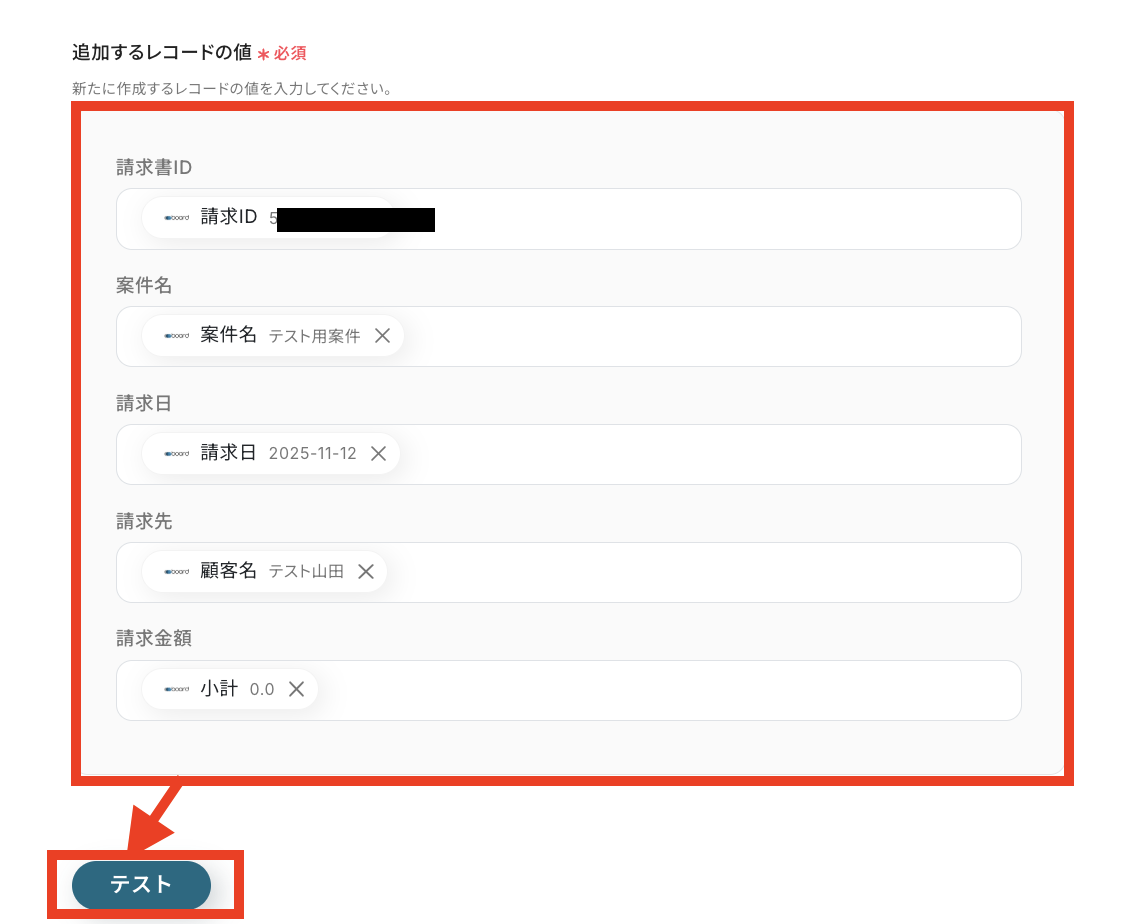 ※今まで設定した条件(請求日、受注ステータス)に合致する案件がないとテストに成功しません。