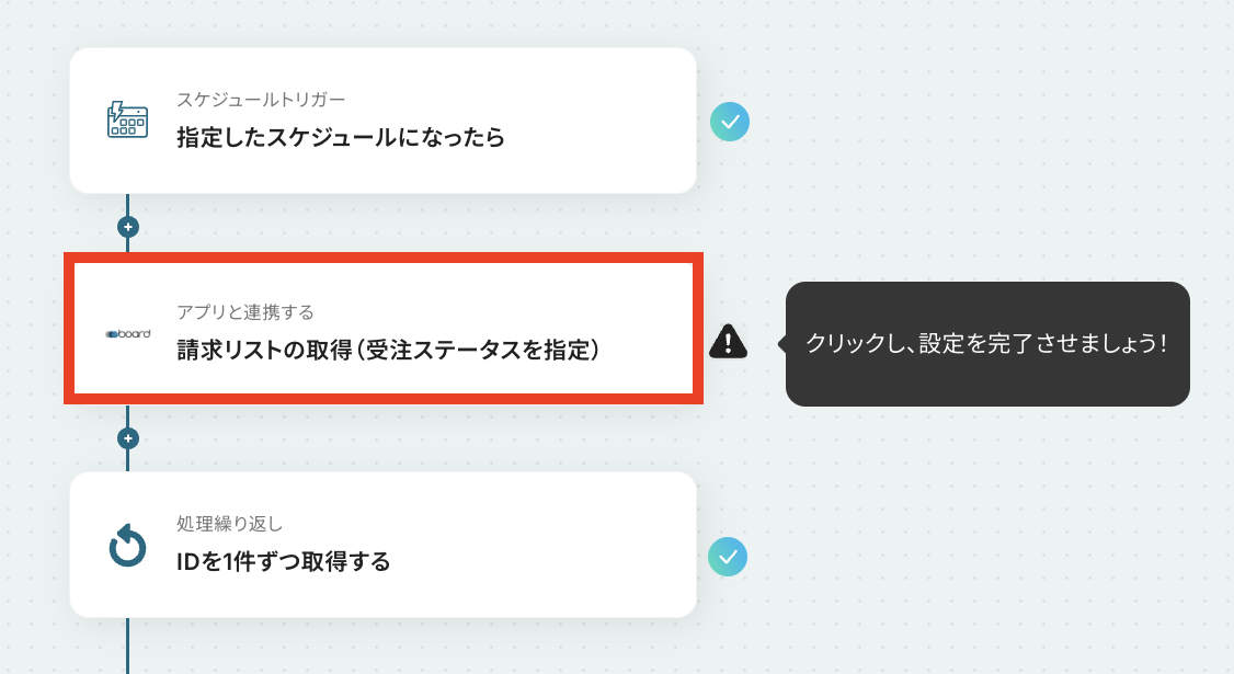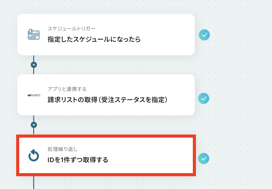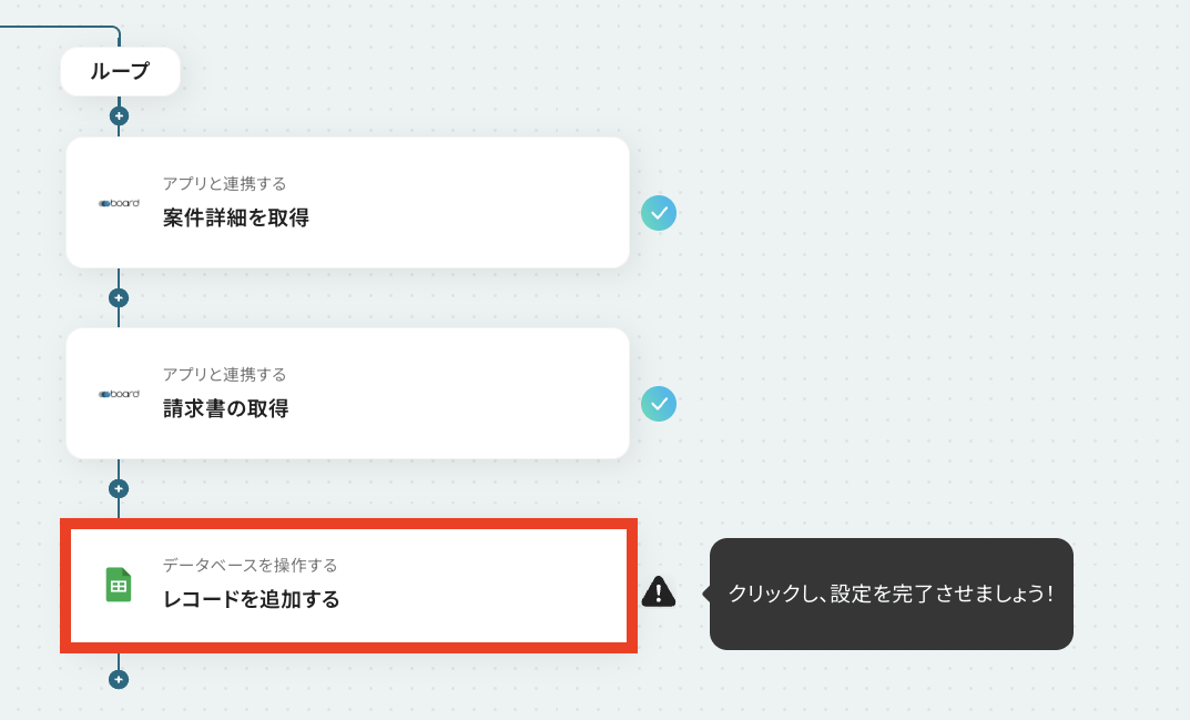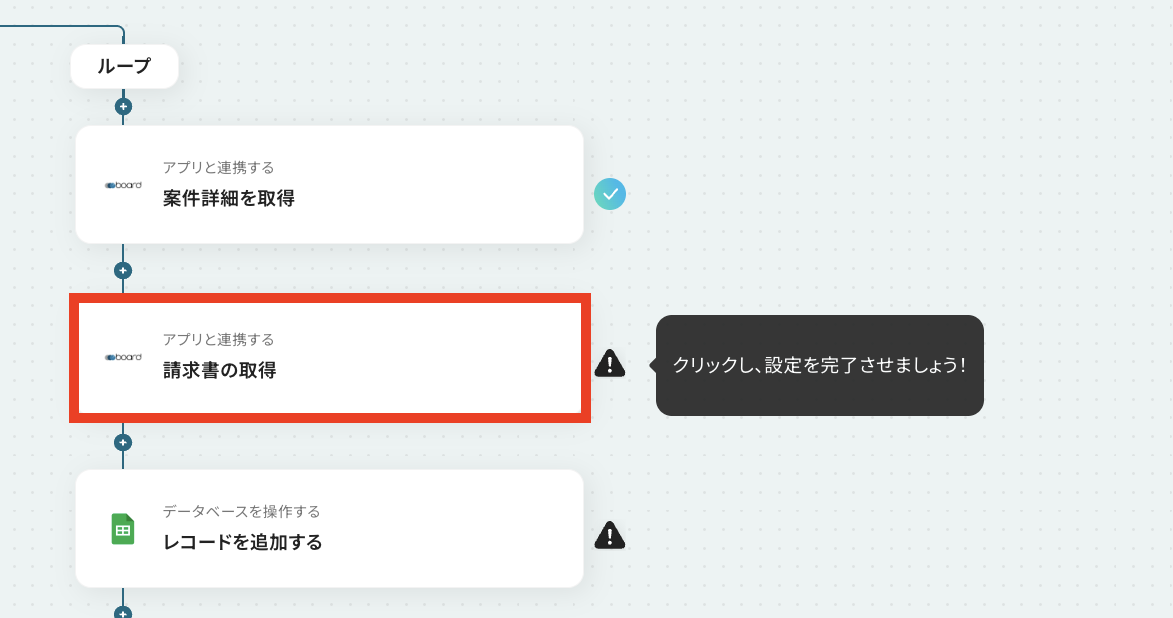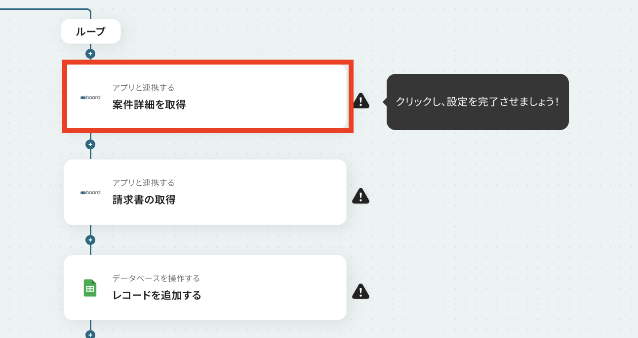 - 繰り返し処理の中で、boardの「案件詳細を取得」「請求書の取得」アクションを設定します