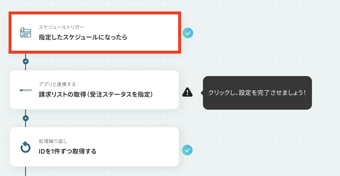 それではここから代表的な例として、指定した日時にboardから請求リストの情報をAPIで取得し、Google スプレッドシートに自動で追加していくフローを解説します!