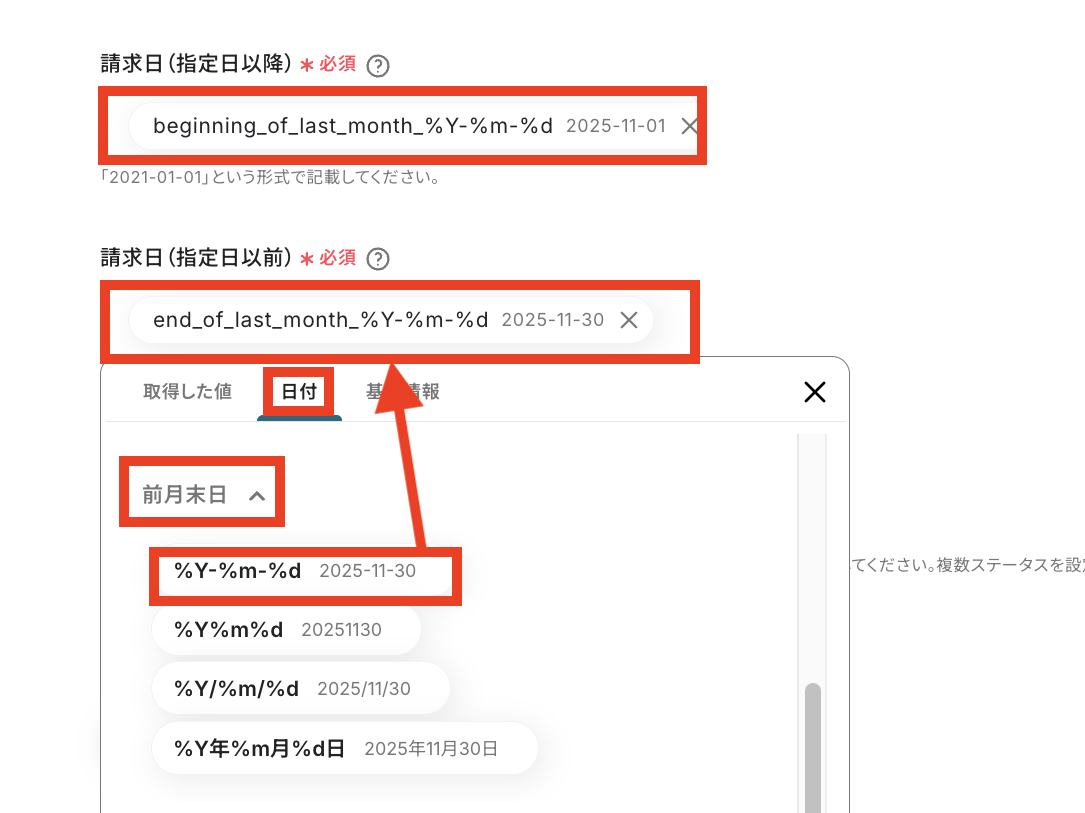 今回は月初に前月分の請求リストを取得することを想定しているのが画像の通り、設定しています!