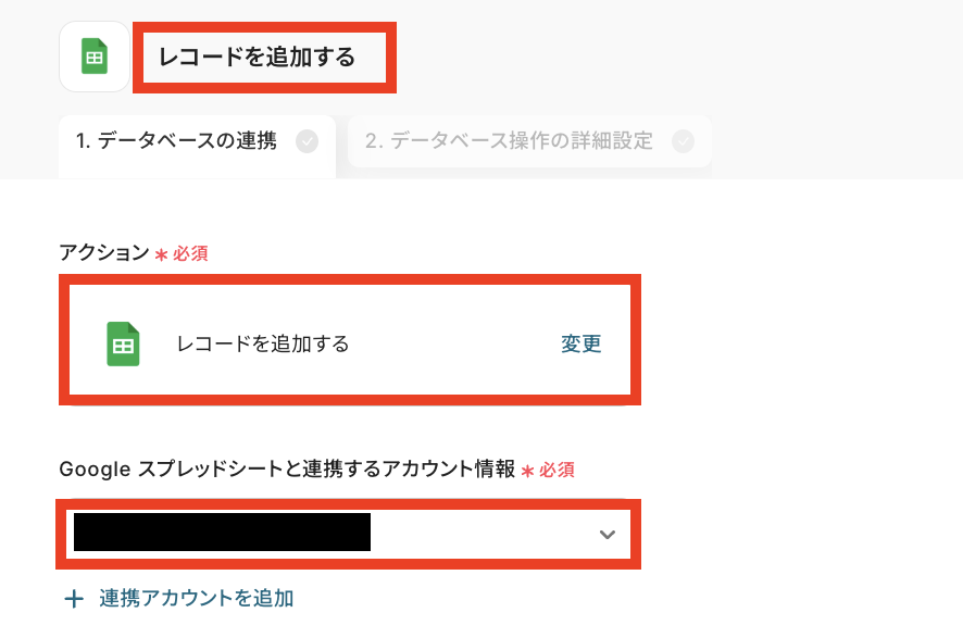 - 最後に、Google スプレッドシートの「行を追加」アクションで、取得した情報を指定のシートに追加するよう設定します