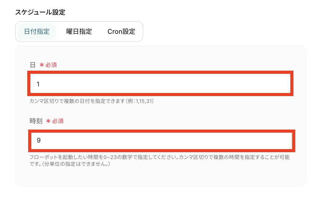 デフォルトでは「毎月1日/朝9時」にフローボットが起動される設定となっていますが、起動する日や時間帯は必要に応じて変更してください。