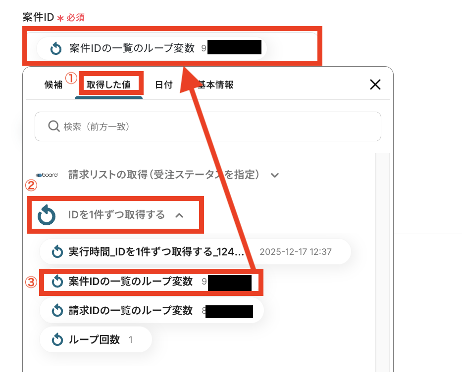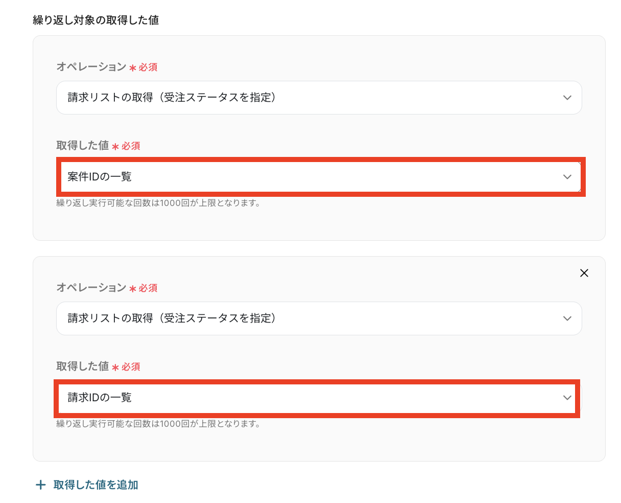 「繰り返し対象」として「案件IDの一覧」と「請求ID一覧」を選んでください。