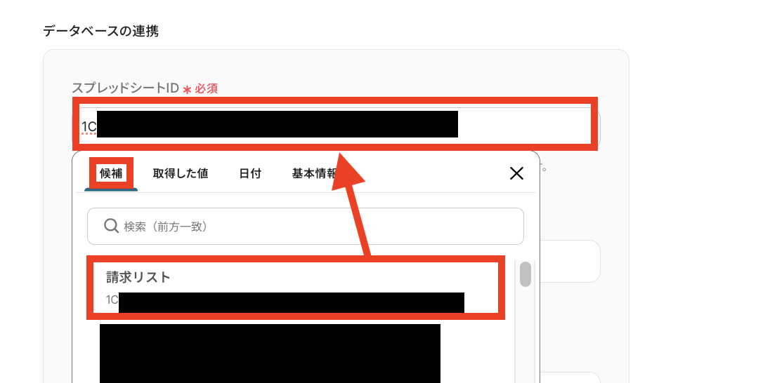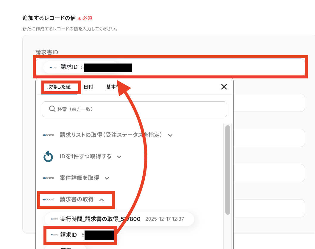 - boardの請求リスト取得アクションでは、請求日や受注ステータスなどの取得条件を任意で設定できます。