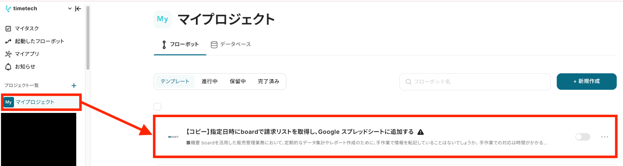 左側にあるメニューの「マイプロジェクト」から、コピーしたテンプレートを開きます。
