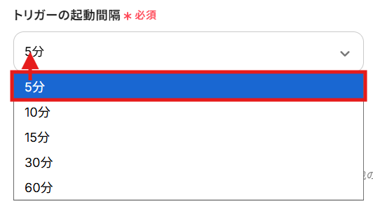 次に、YoomがSalesforceのリード情報を何分間隔で確認するかを設定します。 編集欄をクリックし、5分、10分、15分、30分、60分から任意で選択してください。 ご利用プランにより設定できる最短の間隔が異なるため、ご注意ください。 なお、基本的にはそのプランの最短の起動間隔にしてお使いいただくことをおすすめします。