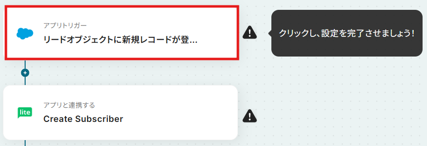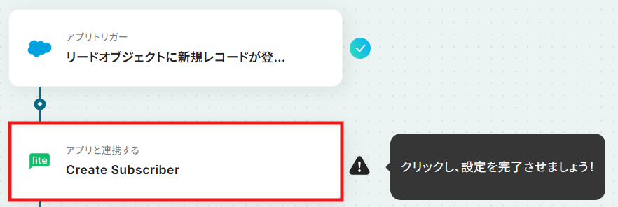 ステップ4:MailerLiteのアクション設定 次に、Salesforceで作成したリード情報をもとに、MailerLiteのSubscriberとして追加する設定を行います。 「Create Subscriber」をクリックしてください。