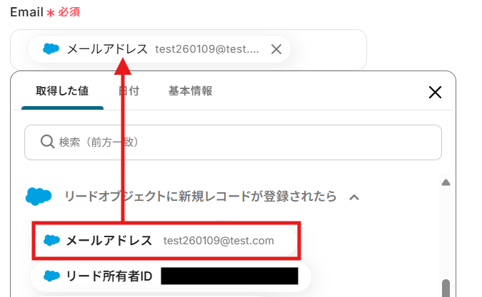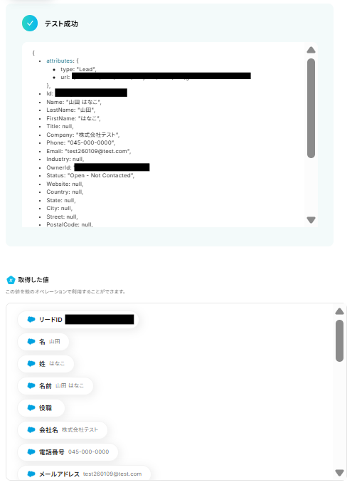 テストに成功すると、取得した値の各項目の横に、Salesforceで登録したリードの詳細情報が表示されます。 「保存する」をクリックして完了です!
