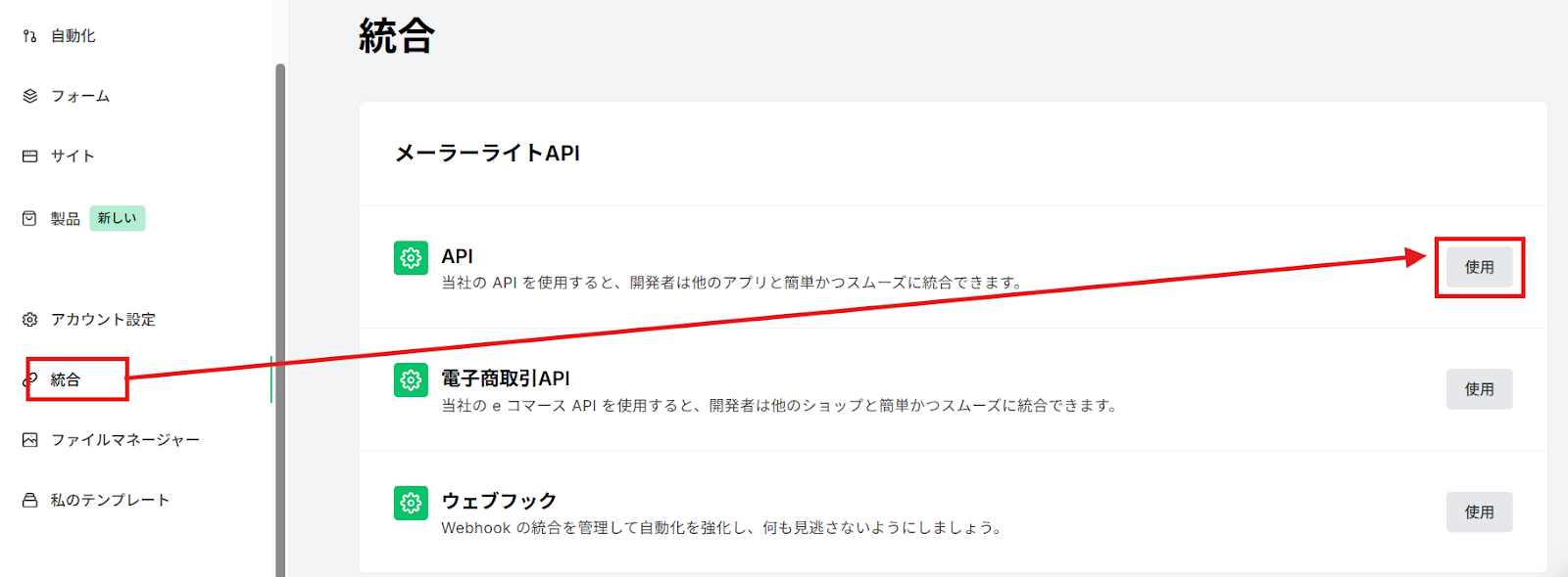 アクセストークンは、MailerLiteから取得できます。 MailerLiteにログインして、「統合」>「APIの使用」をクリックしてください。