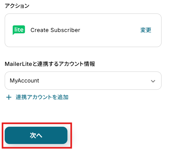 クリックすると以下の画面に移ります。 Salesforceと同様に、ステップ1でマイアプリ連携したMailerLiteのアカウント情報が自動で表示されます。 アクションは、「Create Subscriber」のままで次に進みましょう!