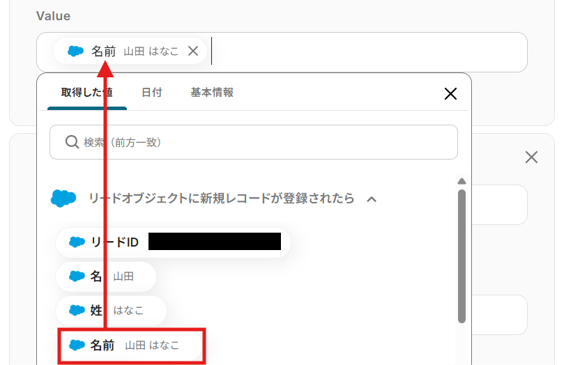 【Tips】 取得した値を活用することで、フローボットを起動する度に変動する値として反映されます。 これにより、毎回変動する情報を手動で入力する必要がなくなり、効率的に連携できます!