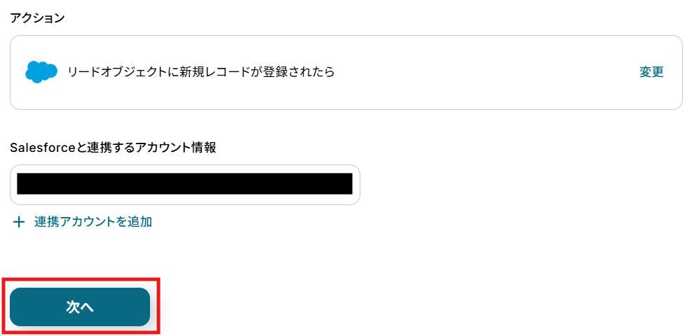 クリックすると以下の画面に移ります。 アカウント情報と書かれた項目にはステップ1でマイアプリ連携した際のアカウント情報が記載されています。 アクションは、「リードオブジェクトに新規レコードが登録されたら」のままで次に進みましょう!