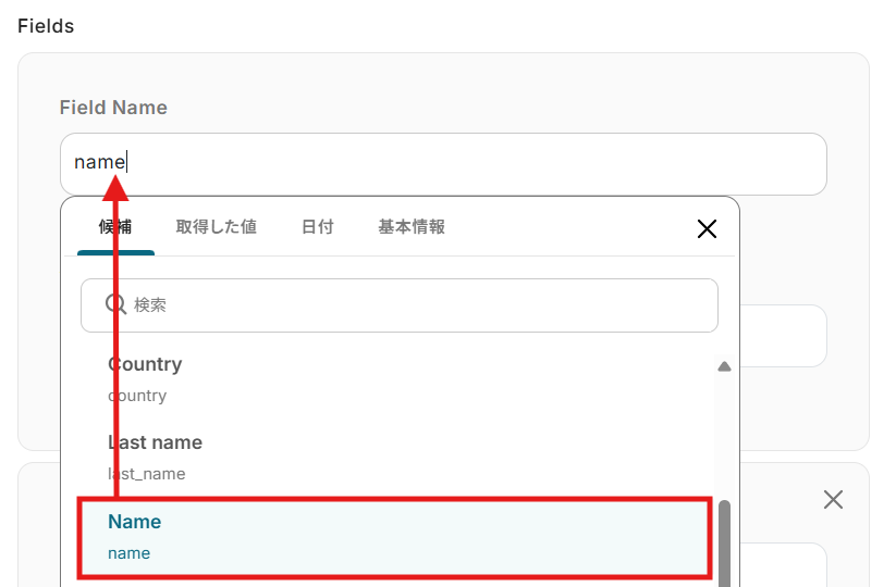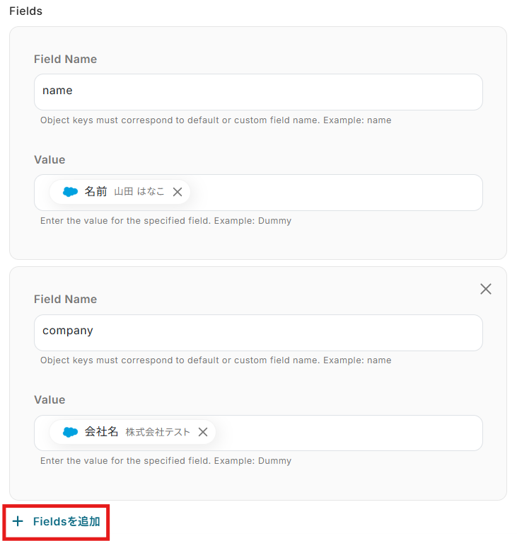 フィールドを追加したい場合は、赤枠内の 「Fieldsを追加」 をクリックすることで設定できます。