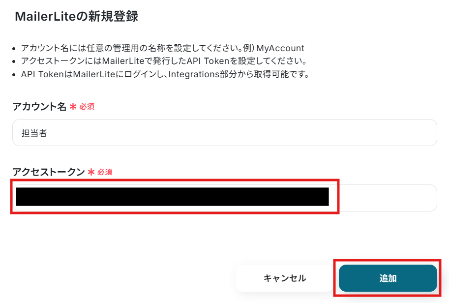 1.MailerLiteのマイアプリ連携 アプリ一覧で、MailerLiteを検索し選択すると、以下の画面が表示されます。 アカウント名は、担当者など任意の名称を入力してください。