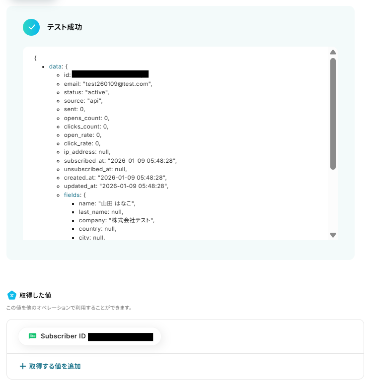 フォームトリガー機能では、氏名・会社名・メールアドレスなど、Subscriber情報として取得したい項目を任意で自由に作成することが可能です。 MailerLiteでSubscriberを作成するオペレーションでは、前段のフォームトリガーで取得した情報をそれぞれの項目に対応する変数として埋め込むことができます。 ■注意事項