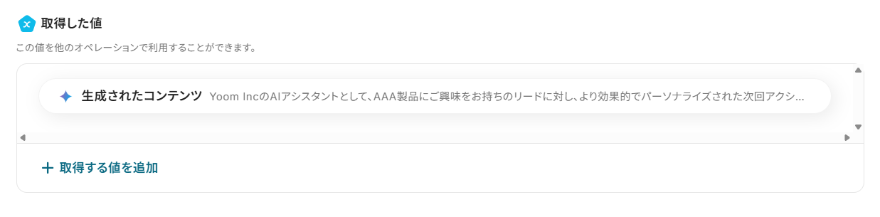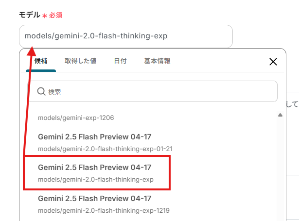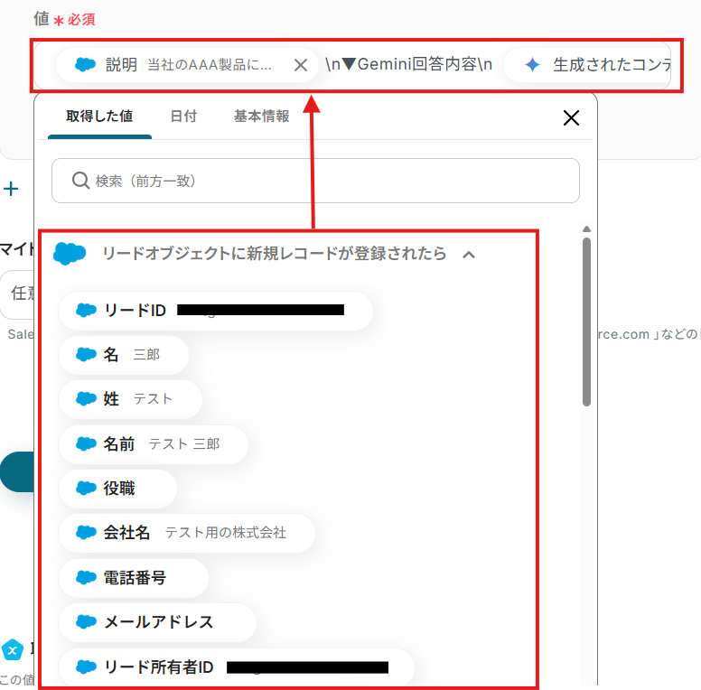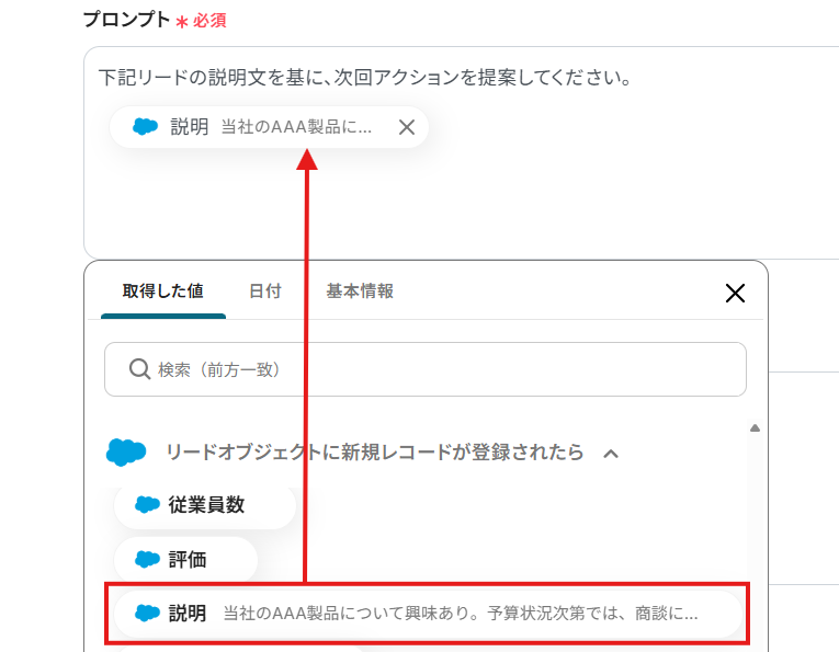 「プロンプト」は、Geminiへの指示を入力しましょう。 入力欄をクリックして表示される取得した値から選択してください。 取得した値を活用することで、固定値ではなく、トリガーが実行されるたびに最新の情報が反映できます。 直接入力した値は、固定値になります。 今回は、以下画像のように設定しました。