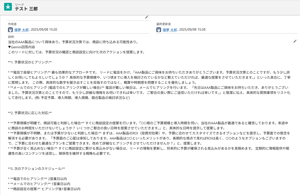 もし、Salesforceのリード情報を基にGeminiが自動で関連情報を生成し、Salesforceに追記してくれる仕組み があれば、情報収集やデータ入力といった定型業務から解放され、顧客とのコミュニケーションといったより重要な業務に集中できる時間を生み出すことができます!