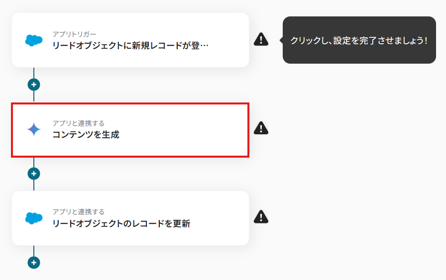 はじめに、SalesforceとGeminiをYoomと連携します。 次に、トリガーでSalesforceを選択し、「リードオブジェクトに新規レコードが登録されたら」というアクションを設定します。 次に、オペレーションで分岐機能を設定し、特定の条件を満たしたリードのみ後続の処理に進むようにします。 次に、オペレーションでGeminiの「コンテンツを生成」アクションを設定し、リード情報をもとに任意の情報を生成します。 最後に、オペレーションでSalesforceの「リードオブジェクトのレコードを更新」アクションを設定し、Geminiが生成した情報を任意の項目に追加します。 ※「トリガー」:フロー起動のきっかけとなるアクション、「オペレーション」:トリガー起動後、フロー内で処理を行うアクション
