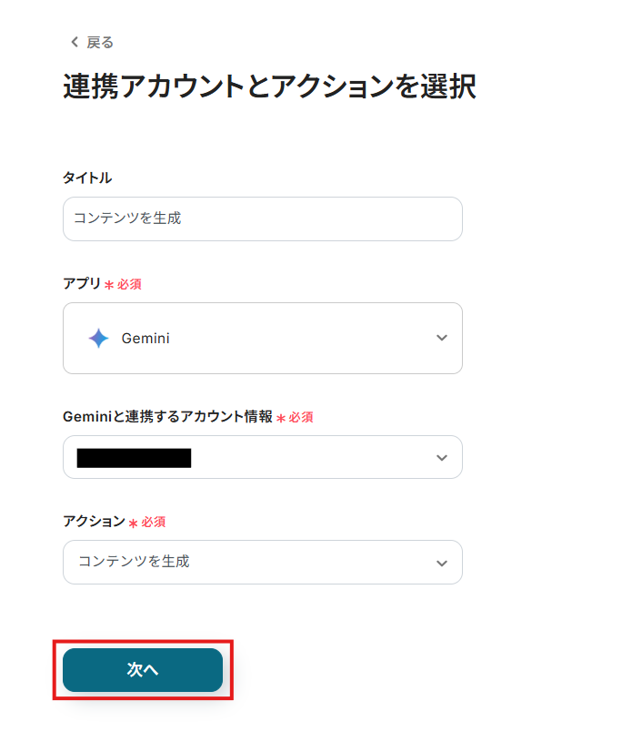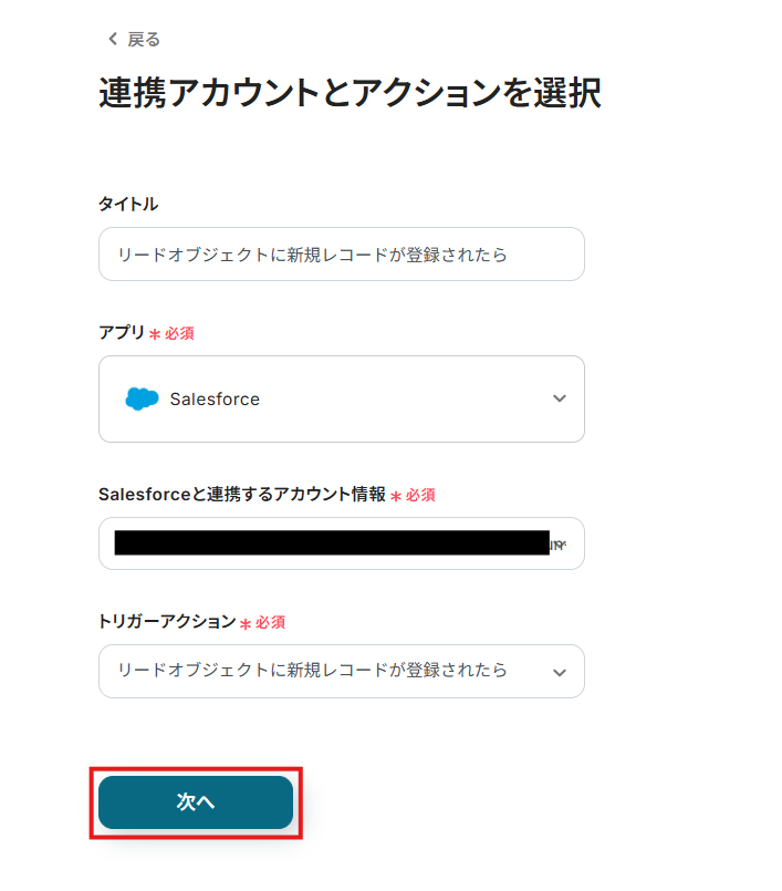 2.連携アカウントとアカウント選択画面が表示されるので、設定内容を確認しましょう。 連携するアカウント情報には、ステップ1で連携したアカウント情報が反映されています。 トリガーアクションはそのままにして、「次へ」をクリックしてください。