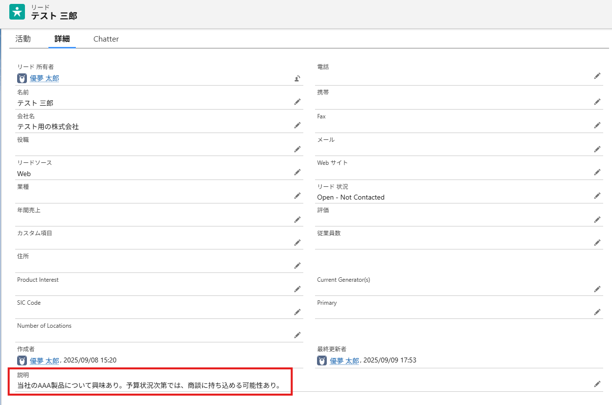 今回は下図のようなリードを作成してみました。 テスト用のため、リード内容は架空の情報(「株式会社test」や「テスト太郎」など)でOKです!
