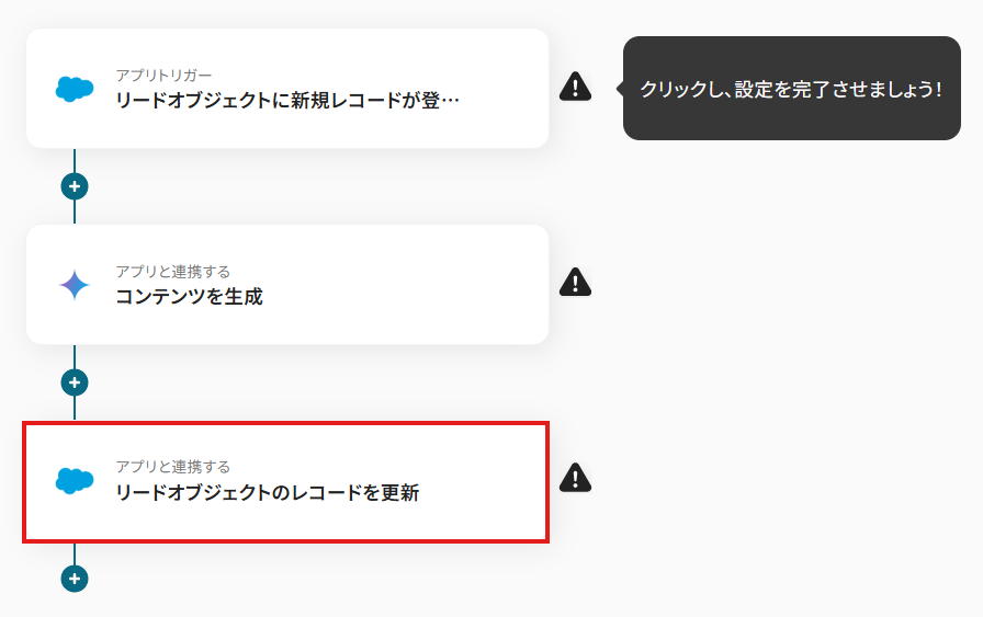 A:はい、可能です。 今回ご紹介したテンプレートを活用する場合、Salesforceの「リードオブジェクトのレコードを更新」を削除し、以下画像の「+」マークからSalesforceを選択し、「レコードを更新する」アクションを設定してください。「レコードを更新する」アクションで、「オブジェクトのAPI参照名」にカスタムオブジェクトを候補から設定してくださいね。 これにより、リードオブジェクト内のカスタム項目へ情報を追記することが可能です。