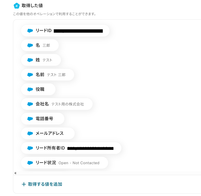 ※取得した値とは? トリガーやオペレーション設定時に、「テスト」を実行して取得した値です。 取得した値は、後続のオペレーション設定時の値としてご利用いただくことができ、フローボットを起動する度に、変動した値となります。 詳しくは、こちら をご参照ください。