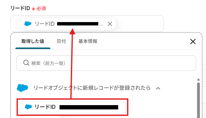 2.API接続設定を行います。 「リードID」は、入力欄をクリックして表示される取得した値から選択してください。
