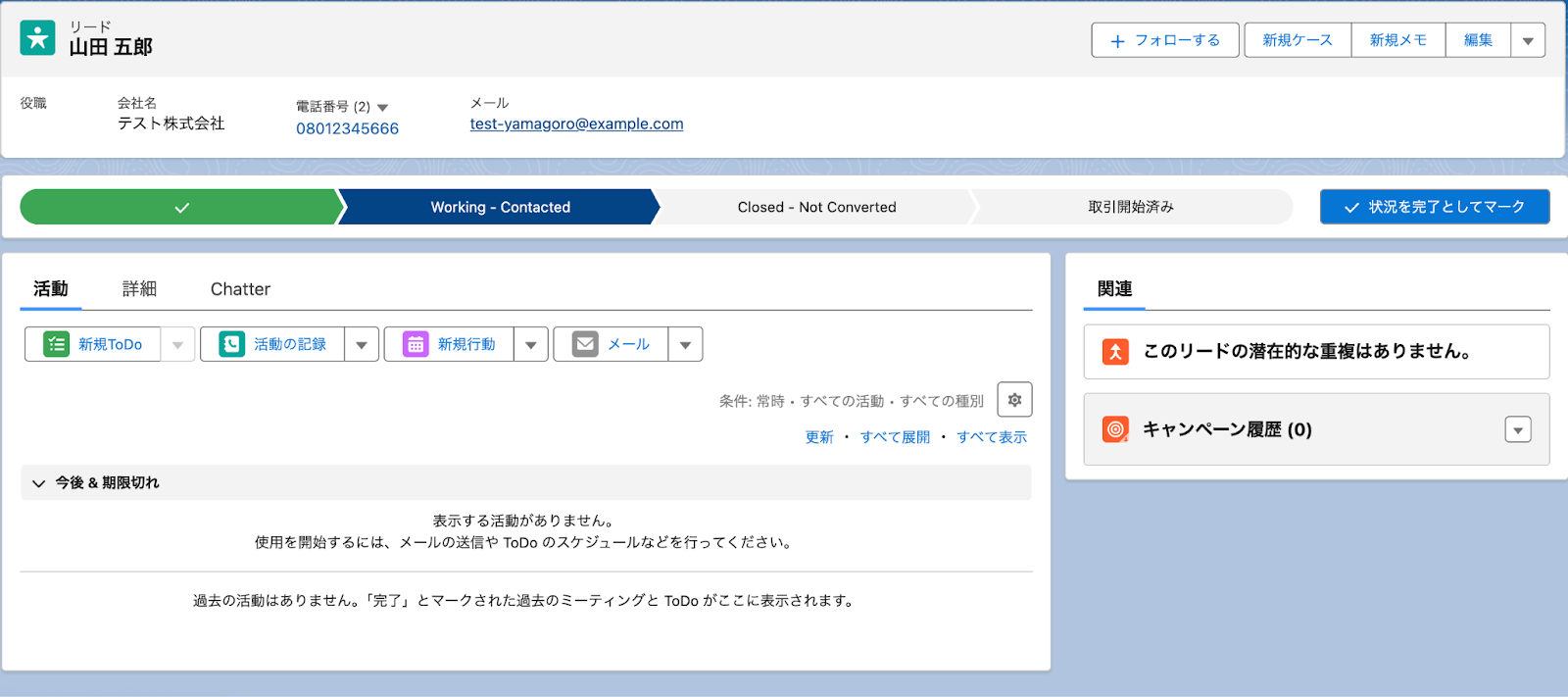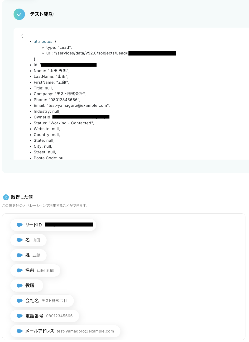テストに成功すると、Salesforceでリードオブジェクトに登録された新規レコードに関する情報が一覧で表示されます。