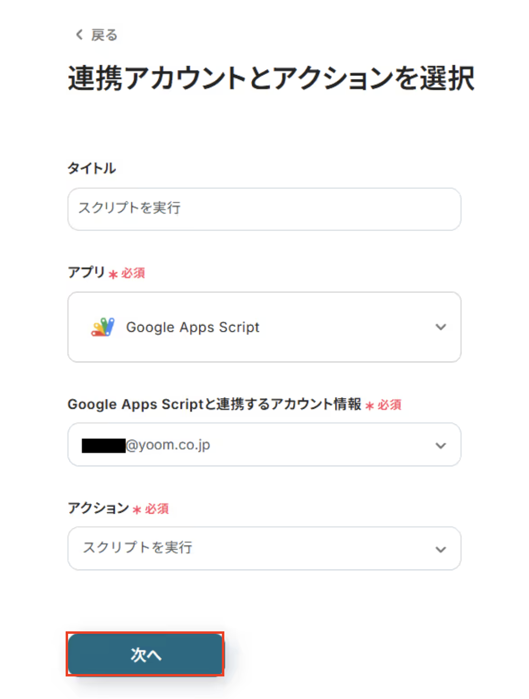 Google Apps Scriptと連携するアカウント情報に問題がなければ、「次へ」をクリックします。