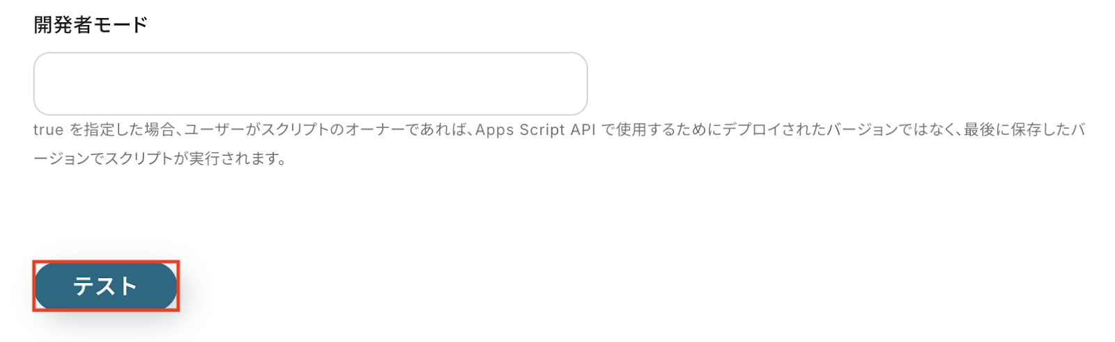 入力が完了したら「テスト」をクリックして、設定した内容でスクリプトが実行されるか確認しましょう。