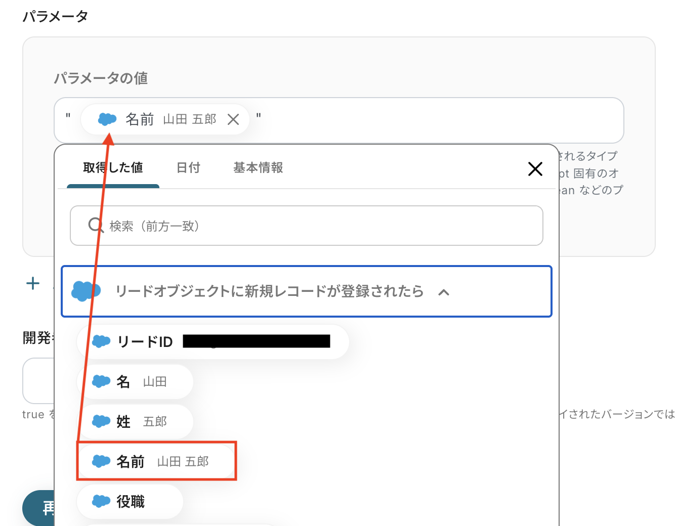 入力欄をクリックすると、前のステップでSalesforceから取得した値が表示されるので、選択して入力することも可能です。