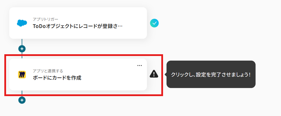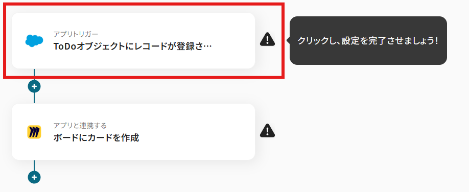 例えば、Salesforceの「ToDoオブジェクトにレコードが登録されたら」をトリガーに設定し、オペレーションをMiroの「ボードに付箋を作成」に設定することで、ToDoオブジェクトにレコードが登録されたらMiroのボードに付箋を作成できます。
