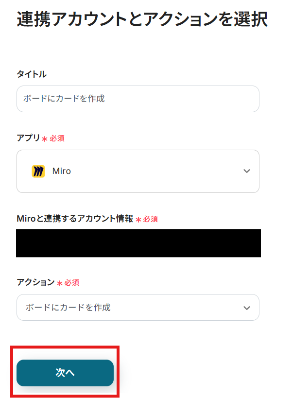 - 最後に、オペレーションでMiroの「ボードを作成」アクションを設定し、抽出したテキストを元に新しいボードを作成します