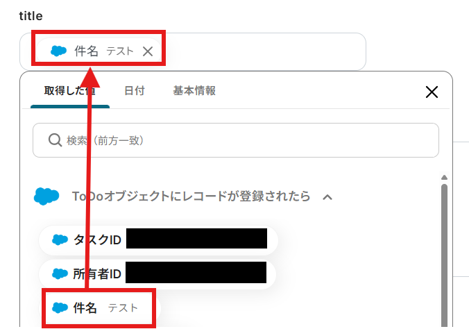 - boardへの案件登録アクションでは、固定値や前段で取得した情報を変数として利用し、案件名や顧客情報などの各項目に設定が可能です。