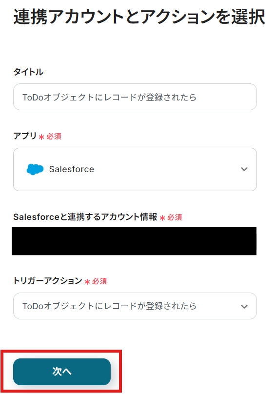 - 次に、トリガーでSalesforceを選択し、「ToDoオブジェクトにレコードが登録されたら」というアクションを設定します。