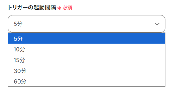 - トリガーの起動タイミングは、5分、10分、15分、30分、60分のいずれかで設定できます。