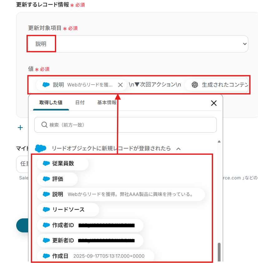 「値」は、入力欄をクリックして表示される取得した値から選択してください。