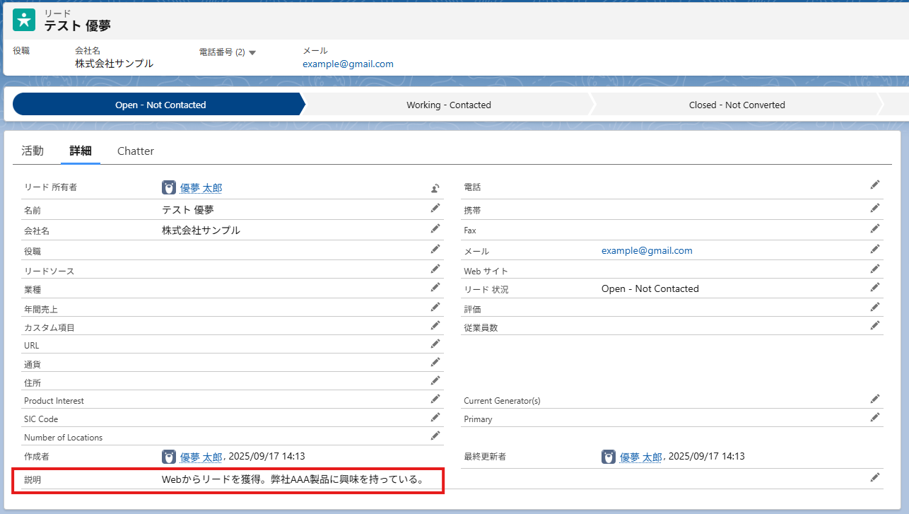 本記事で使用した項目「説明」は、Salesforceの既存の項目です。