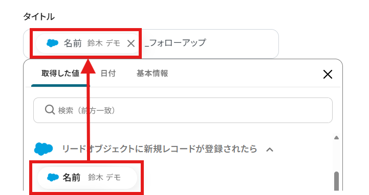 今回は「タイトル」を「取得した値」と固定のテキストを使用して、以下のように設定しました!