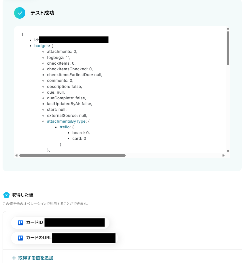 テストに成功すると「取得した値」に反映されます。詳しくは以下をご覧ください。