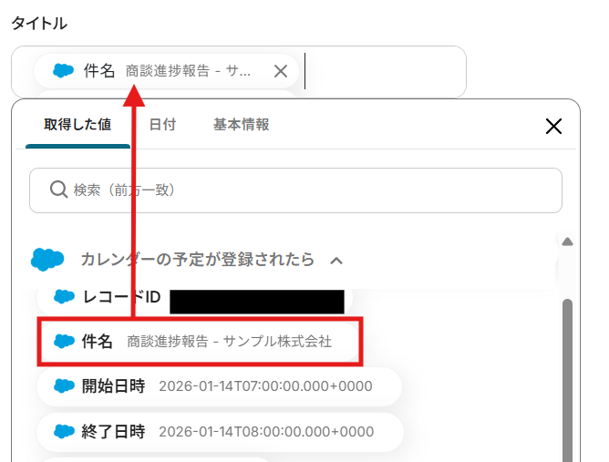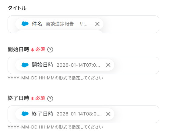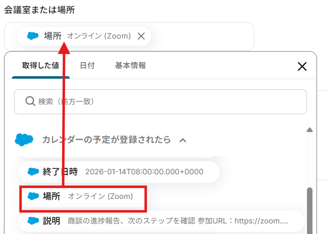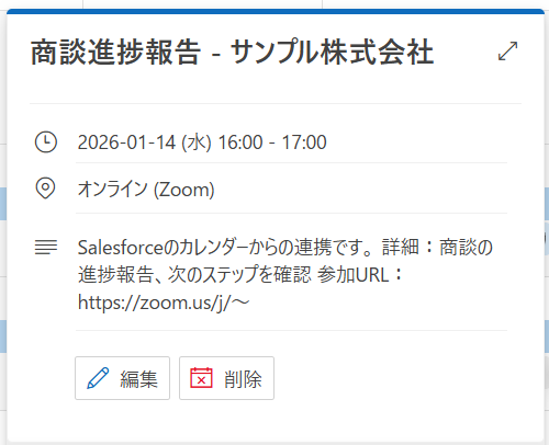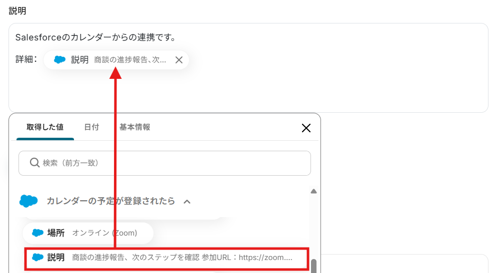 編集欄をクリックして、「カレンダーの予定が登録されたら」から、Salesforceに登録した予定の詳細情報を引用できます。