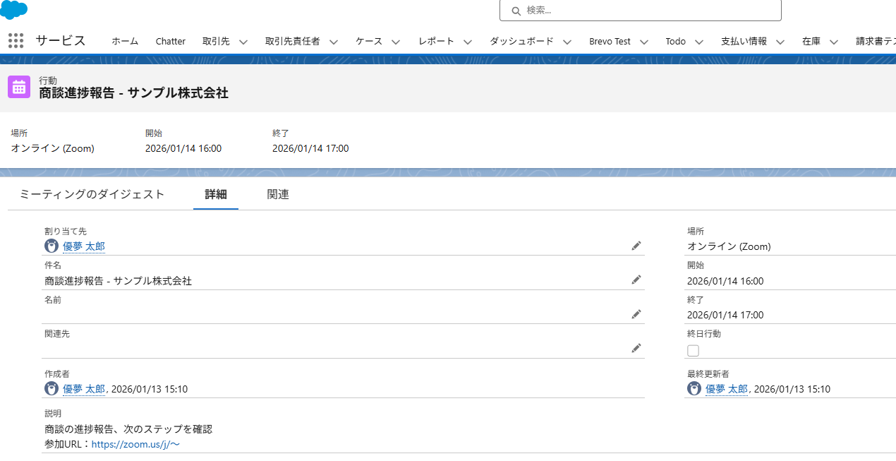 まずは事前準備として、Salesforceに移動して、カレンダーにテスト用の予定を登録してください。