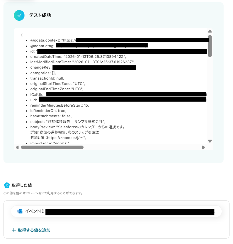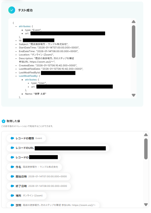 テストが成功すると、取得した値の各項目の横に、Salesforceで登録した予定の細情報が表示されます。