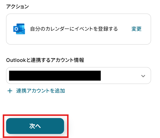 Salesforceと同様に、ステップ1でマイアプリ連携したOutlookのアカウント情報が自動で表示されます。