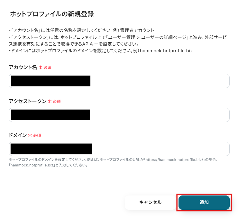 次の画面で、必須項目を入力し、「追加」をクリックしましょう。