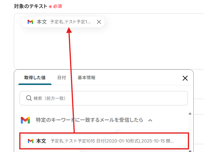 「対象のテキスト」は、入力欄をクリックして表示される取得した値から選択してください。