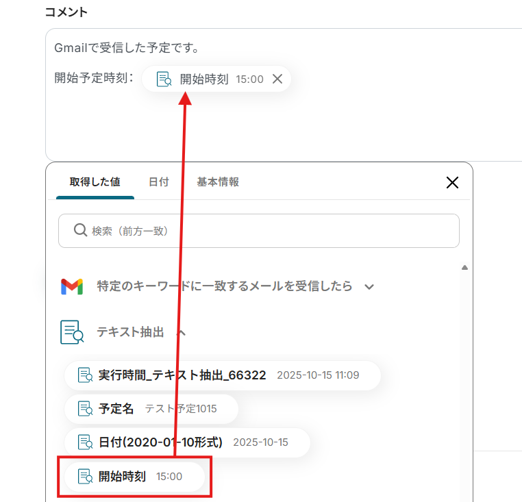 「コメント」は、入力欄をクリックして表示される取得した値(テキスト抽出)から選択してください。