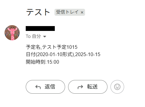 ※固定値で設定すると、毎回同じ内容が通知されてしまいます。今回の「Gmailで受信した予定です。」などの文は固定値で設定しても大丈夫ですが、それ以外は、取得した値を設定するようにしましょう。