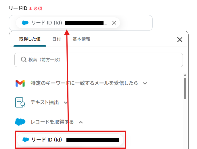 「リードID」は、入力欄をクリックして表示される取得した値から選択してください。